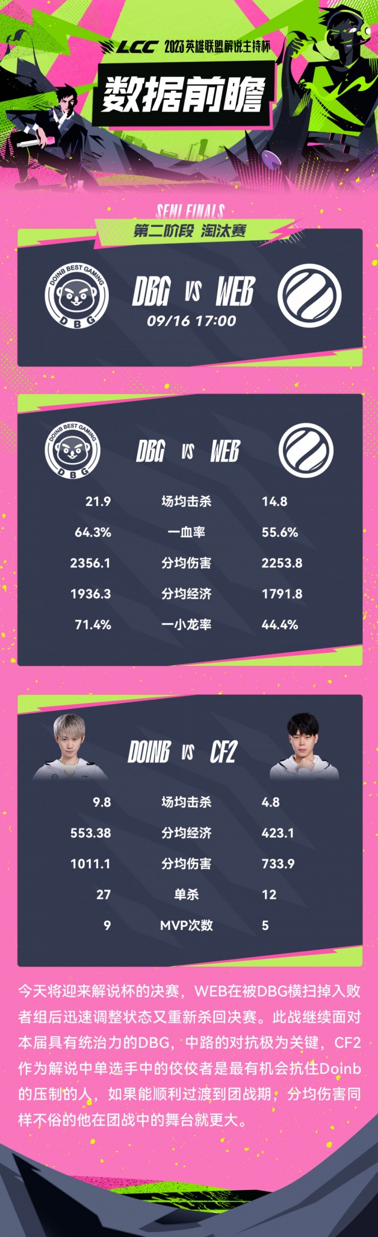 9月16日讯 英雄联盟赛事官博发布S4解说主持杯总决赛,DBG vs WEB(BO5)数据前瞻。