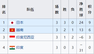 B组日本代表队一路高歌猛进,三场全胜的同时净胜球高达24个,第二名的越南净胜球13个,印度尼西亚和印度被淘汰出局。