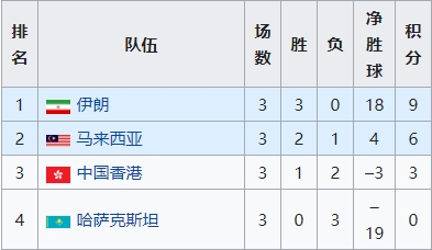A组伊朗代表队三场全胜,净胜球高达18个,轻松以第一名的成绩出线,马来西亚取得两胜一负,净胜球4个排名第二,中国香港一胜两负,净胜球-3个,哈萨克斯坦垫底一场未胜。