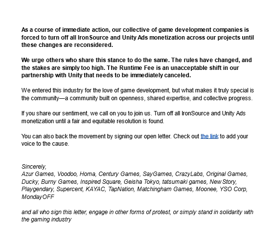 本周早些时候 Unity 宣布将向开发商和发行商收取“运行费”,这一费用将面向超过收入和下载量阈值的游戏收取,并且将按照玩家下载安装游戏的次数收取。这一决定引来了许多开发商的批评。虽然 Unity 后来解释同一设备多次安装不会计算、游戏试玩 Demo 和慈善捆绑包也不会被收费,且估计只有 10% 的开发者会被收取费用,但开发者依然对其计数过程不透明等问题表达了不满,此次抗议也是其中之一。