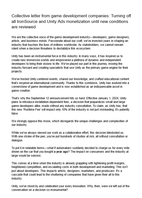 该组织在公开信中表示,Unity 声称“安装费”只会影响“10% 的工作室”是“不仅具有误导性,而且明显是错误的”。