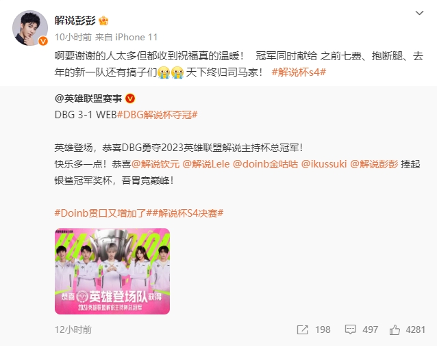 09月17日讯 英雄联盟解说主持杯决赛,DBG队以3-1击败WEB夺得冠军,赛后DBG辅助彭彭更新了微博。彭彭:啊要谢谢的人太多但都收到祝福真的温暖!冠军同时献给之前七费、抱断腿、去年