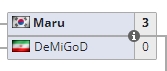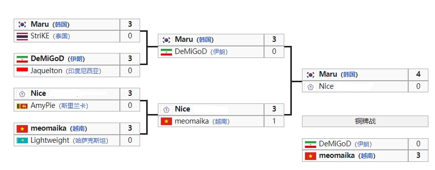 淘汰赛次轮Maru面对来自来自伊朗的人族选手DeMiGoD,依旧没能给Maru造成任何压力。依旧是一场横扫将对手送离亚运会舞台。