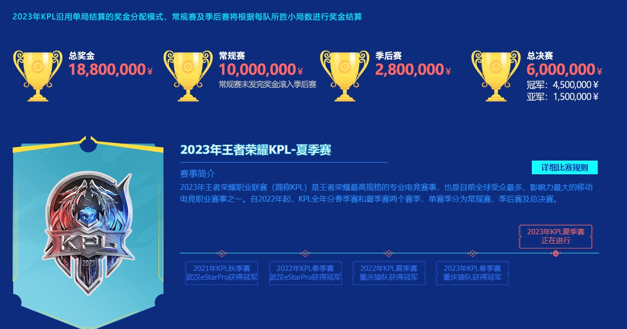 今年KPL夏季赛的总奖金来到1880w人民币,常规赛一千万,季后赛280w,总决赛600w(冠军450w,亚军150w)。