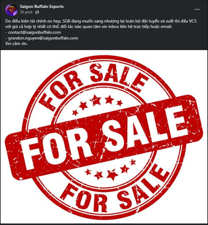 09月19日讯 越南VCS赛区SGB战队更新了Facebook,表示:由于经济困难,Saigon Buffalo愿意以最合理的价格让出整个团队和VCS的名额。在去年SGB就因为资金问题想要出售队伍,后来有一个韩国企业想要收购,后面却不了了之;而今年SGB也没能维持原班人马,交易了多位选手,常规赛成绩一般,在季后赛第三轮2:3遗憾输给TW获得第四名。