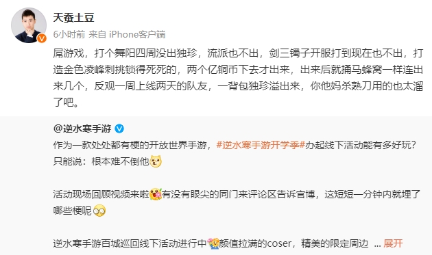 09月19日讯 今天逆水寒手游官方发布了一则线下巡回活动的返厂回顾动态,在此条微博下,知名网文作家天蚕土豆现身,吐槽了游戏内的装备掉落概率问题。逆水寒手游官方回复迅速滑跪,