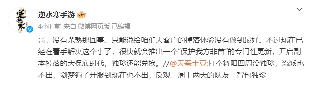 09月19日讯 今天逆水寒手游官方发布了一则线下巡回活动的返厂回顾动态,在此条微博下,知名网文作家天蚕土豆现身,吐槽了游戏内的装备掉落概率问题。逆水寒手游官方回复迅速滑跪,并表示已经在着手修改用户的掉落体验问题,将会推出副本掉落大保底以及开放独珍兑换。