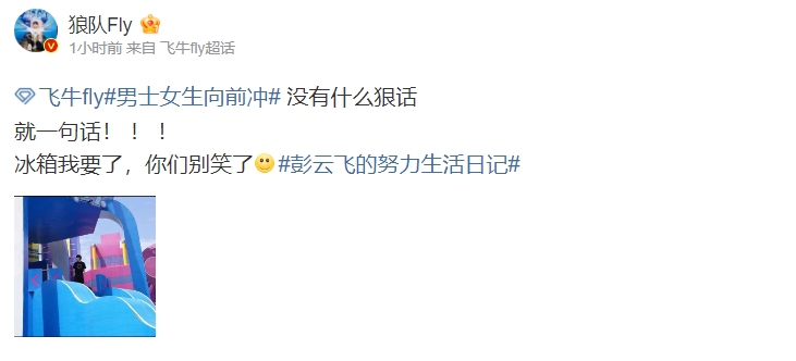 9月19日讯 今日,王者荣耀KPL职业选手Fly更博直言自己将再次参加全民健身榜样节目《男生女生向前冲》,并发话:就一句话! ! !冰箱我要了,你们别笑了!如果落水了我就把我微博头像换成落