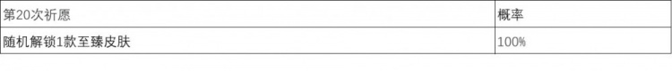第20次祈愿,100%暴击出1款随机至臻皮肤,优先获得未解锁道具。如已拥有全部道具,则可以获得125神话精萃。详情参加文末奖池