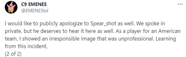 C9韩籍选手Emenes向主播Spearshot致歉:会为言行承担更多的责任