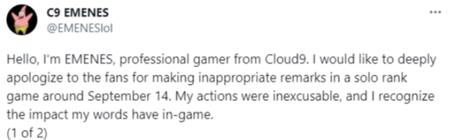 09月20日讯 C9韩籍选手Emenes更新推特,就此前在韩服rank时辱骂国外主播Spearshot称其是“典型的,恶心的欧洲主播”并让其“go to your country(回你的国家去)”涉嫌歧视一事道歉