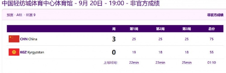 9月20日讯 杭州亚运会男排小组赛,中国男排3-0击败吉尔吉斯斯坦男排迎来开门红。三局比分为25比19、25比18、25比18。