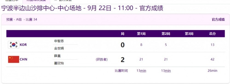 预赛A组第四轮比赛中,中国组合薛晨/夏欣怡以2-0(21-8、21-5)战胜一对韩国组合,以四战全胜战绩结束小组赛。
