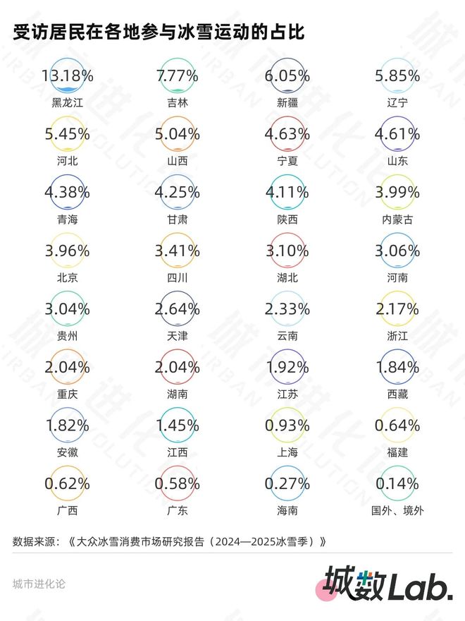 新赛季将至,来看看各地的实力如何?在国家体育总局冬季运动管理中心发布的《大众冰雪消费市场研究报告(2024—2025冰雪季)》中,黑龙江以13.18%的冰雪运动参与率位列全国首位,大幅领先排名其后两位的吉林(7.77%)和新疆(6.05%),且相比上个冰雪季吸引力进一步增强。