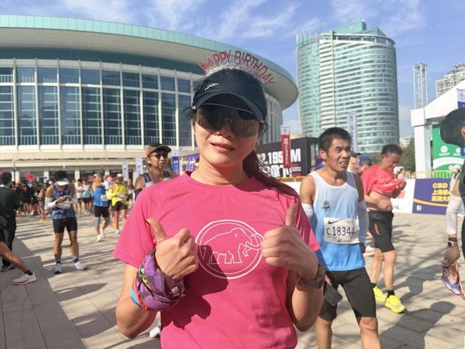 另一位上海本地跑者顾炜慧戴着生日小皇冠,一下子就吸引了澎湃新闻记者的目光,比起在生日当天以3小时37分的成绩实现PB,满赛道的生日祝福让她终生难忘,“生日发卡引来了很多暖心问候,沪语加油站的呐喊声特别亲切,这简直是最特别的生日礼物。”