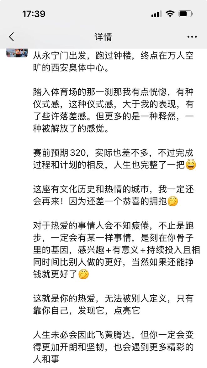 感谢我的所有教练们,特别是龙井教练,因为在赛前对自己的状态基本有认知,99%是PB不了的。赛前几周的连续作战,倒数第二周的强度,虽然也按期减量调整,但状态却越来越差。为什么还有1%呢?因为对于既定好的目标,怎么也要大声说出来,并且只要站上了赛道,我也永远相信那个敢于出发和挑战的自己。真不行,也得跑完再说不行。