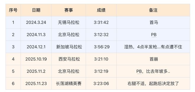 2024年11月3日,我跑了我人生中第二场全程马拉松,北京马拉松,完赛成绩312。只用了半年时间,我就提高了近20分钟,让我以为破3是一件很轻松的事情。现在再回顾当时的那篇复盘文章,这看似轻轻松松地就提高了,实际上只是因为那个夏训的96次课表,我完成了89次之多,出勤率92.7%,这中间训练几乎没被打断过。