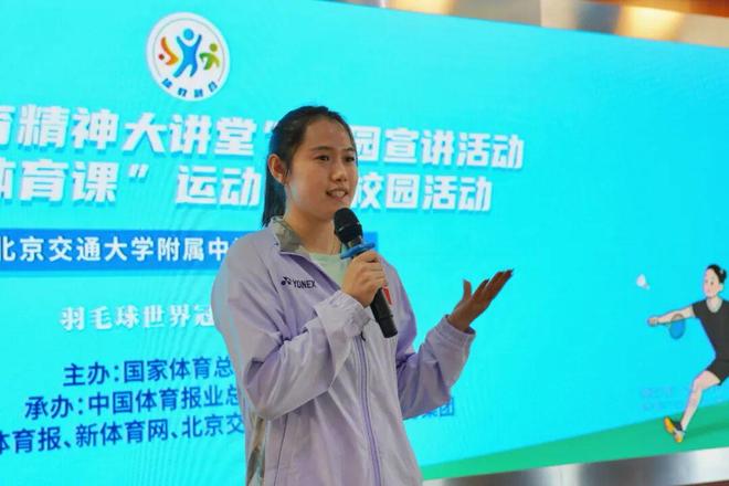 12月2日,“中华体育精神大讲堂”校园宣讲活动、“冠军体育课”运动员进校园活动走进北京交通大学附属中学,羽毛球世界冠军郑雨分享了自己在赛场上的拼搏故事,为大家上了一堂别