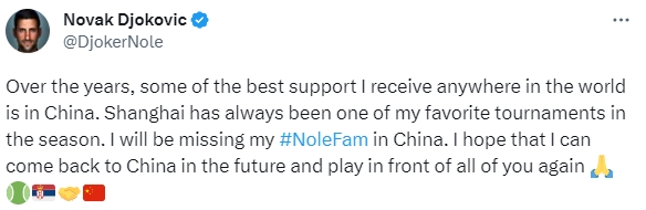 德约科维奇在推特写到:“多年来,在全球范围内,我收到的一些最好的支持就来自中国。上海(大师赛)一直是我赛季中最喜欢的比赛之一。我会想念我在中国的NoleFam(德约粉丝昵称)。希望将来我能再次回到中国,在你们面前比赛。”