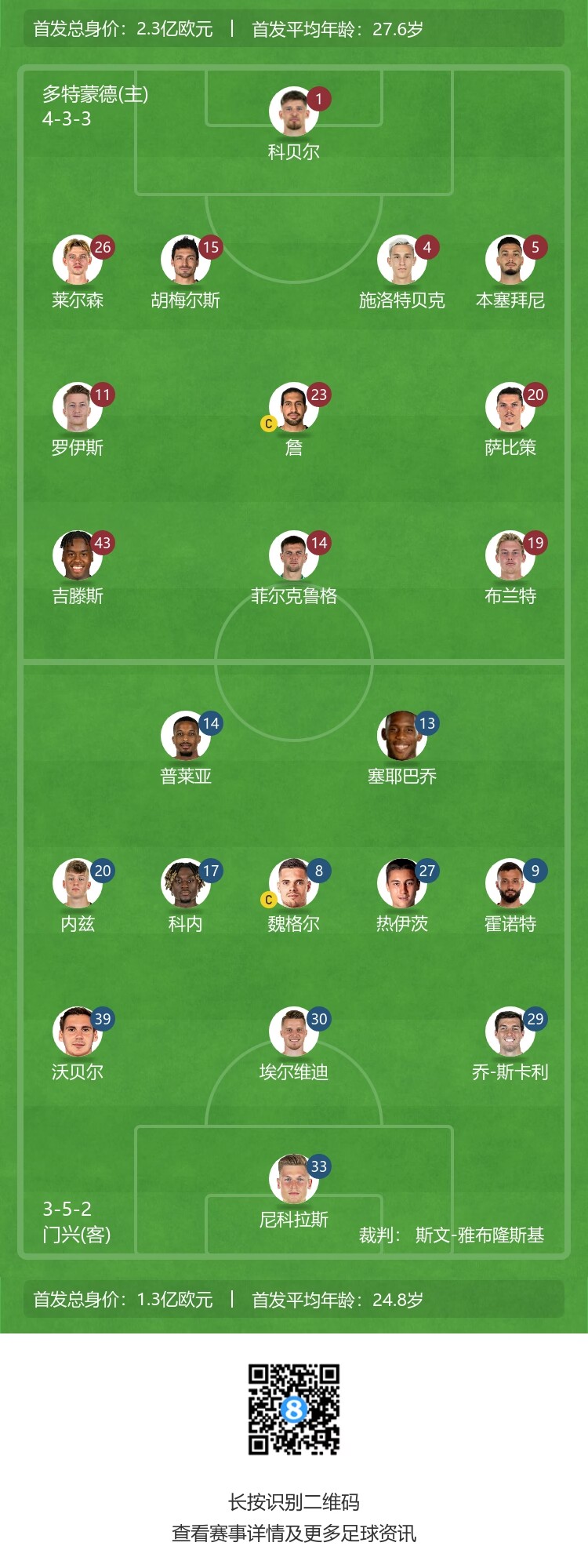 多特首发:1-科贝尔、26-莱尔森、4-施洛特贝克、15-胡梅尔斯、5-本塞拜尼、11-罗伊斯、19-布兰特、20-萨比策、23-埃姆雷-詹、14-菲尔克鲁格、43-吉滕斯