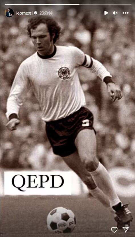 1月9日讯 德国传奇球星、“足球皇帝”贝肯鲍尔去世,享年78岁。对此,梅西发ins悼念,并写道:“QEPD(安息!)”