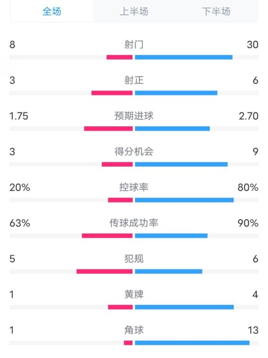 费耶诺德30拜仁数据:射门830,射正36,控球率20%80%