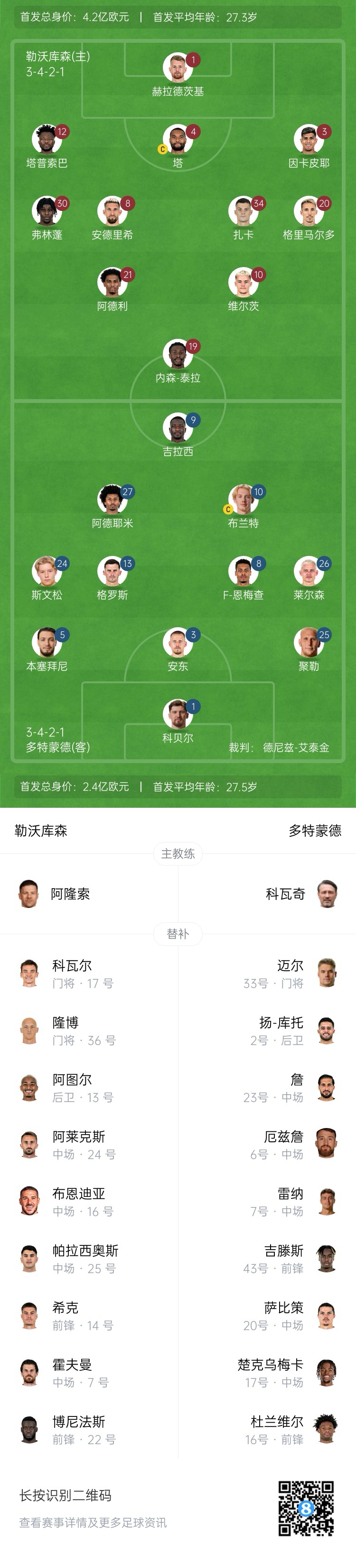 勒沃库森首发:1-赫拉德茨基、3-因卡皮耶、4-若纳坦-塔、12-塔普索巴、20-格里马尔多、30-弗林蓬、34-扎卡、8-安德里希、21-阿德利、10-维尔茨、19-内森-泰拉