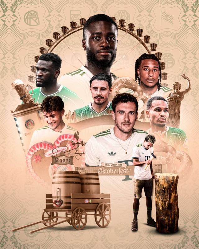 拜仁官方社媒晒出了啤酒节风格海报,于帕梅卡诺、格雷茨卡、奥利塞、比朔夫、迪亚斯出镜。