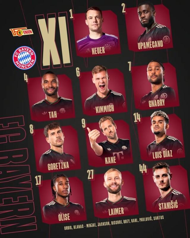 拜仁首发:凯恩、路易斯·迪亚斯出战