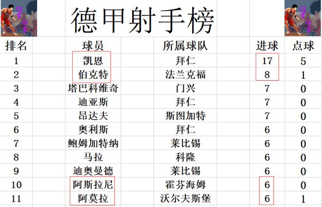 射手榜方面,凯恩17球稳居榜首,伯克特8球排在第2,塔巴科维奇,迪亚斯和昂达夫7球并列第3。阿斯拉尼,阿莫拉进球,追上奥利斯,鲍姆加特纳等人,将前十门槛提高到6球。