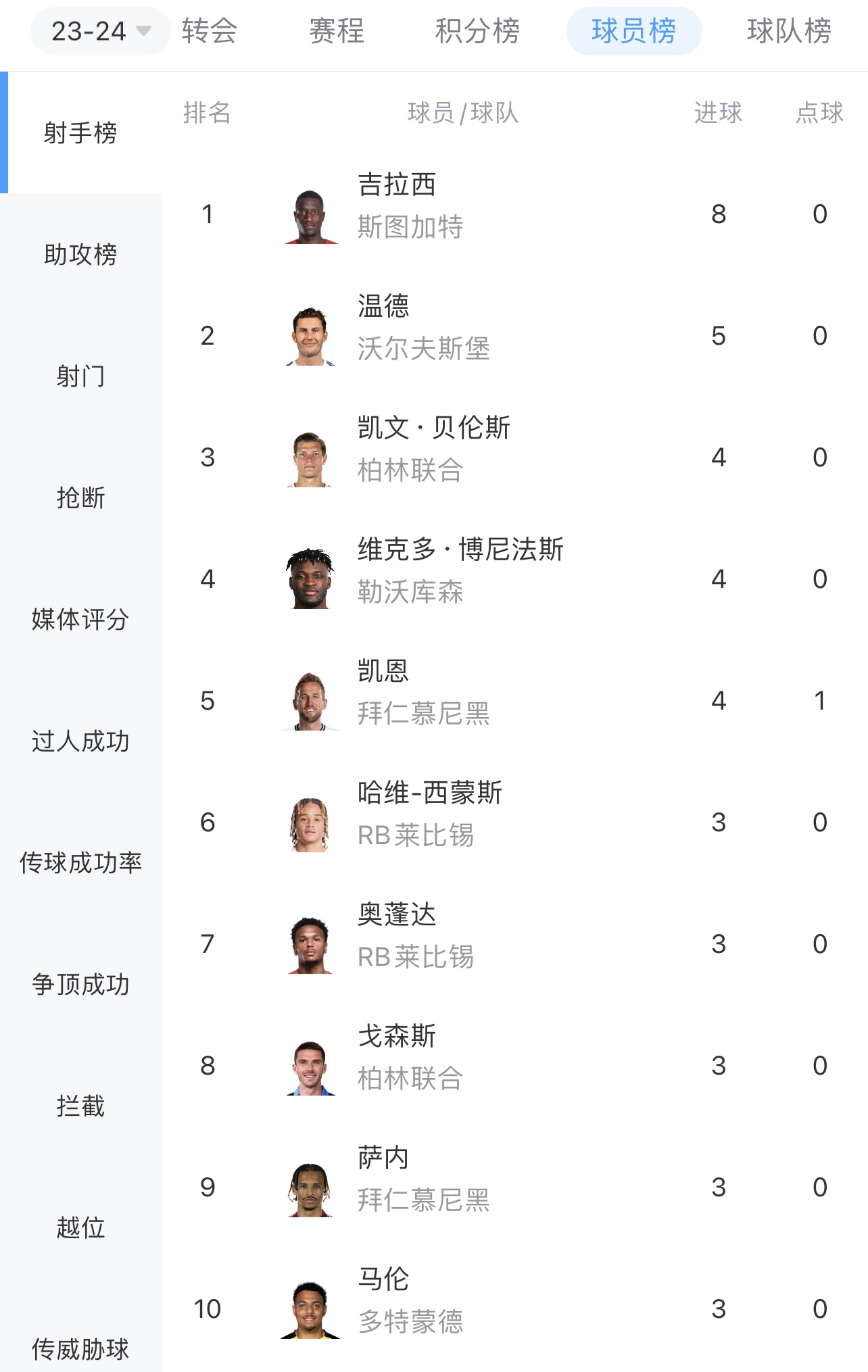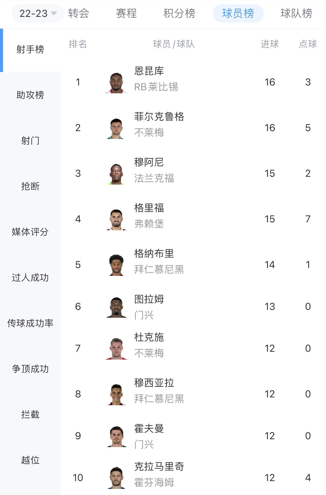 本赛季德甲射手榜↓