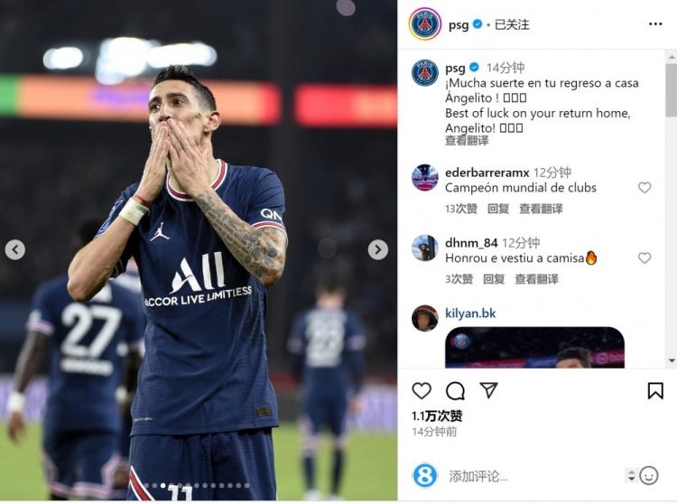 巴黎官方社媒晒出迪马利亚的照片,并写道:“祝你回家一切顺利,天使!”