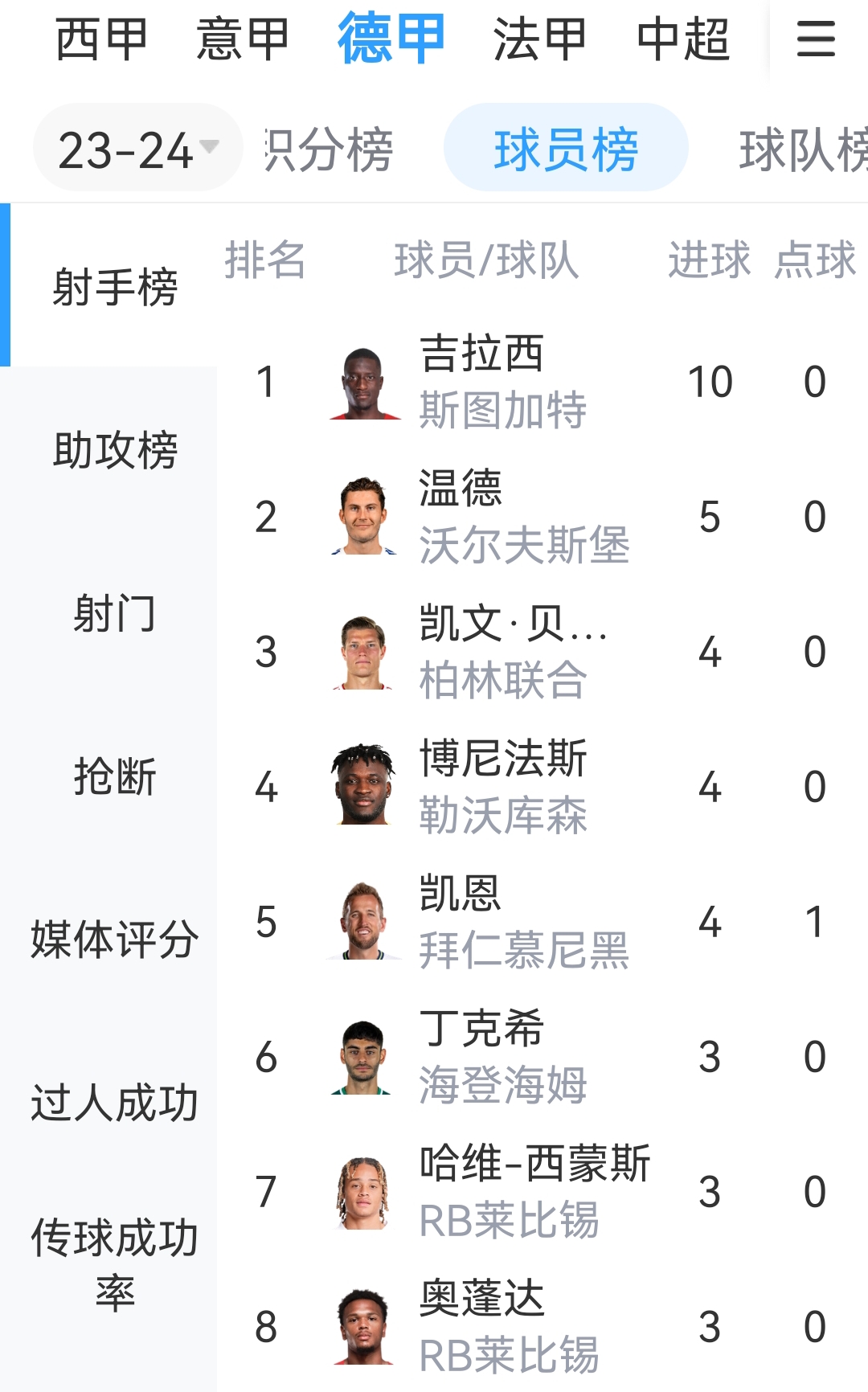 追平莱万纪录!斯图加特前锋吉拉西前5轮德甲轰入10球