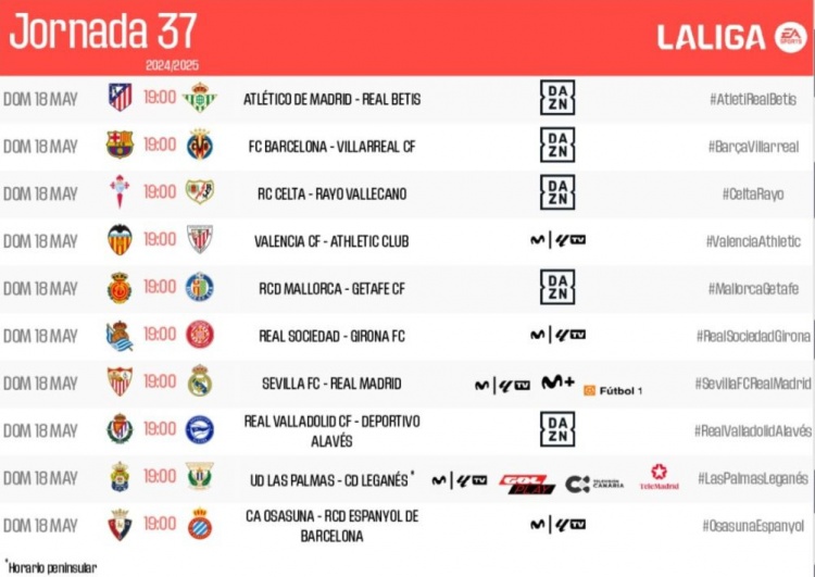 官方:西甲第37轮比赛统一在5月19日凌晨1点开球