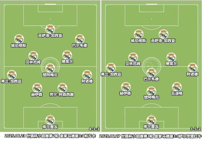 由于麾下缺少熟悉三中卫阵型的球员,哈维-阿隆索来到皇马后没有急于铺陈个人意志。小组赛前两战,阿隆索使用的都是安切洛蒂留下的433阵型,到了比赛最后阶段才尝试三中卫阵型。小组赛第三轮对阵萨尔茨堡红牛,阿隆索正式推出三中卫架构,怀森、贡萨洛-加西亚、弗兰-加西亚和居勒尔等人成为体系粘合剂。