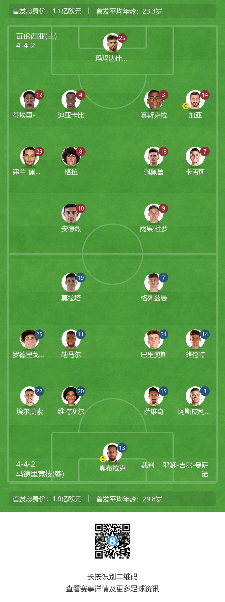 瓦伦西亚首发:25-玛玛达什维利、12-蒂埃里-科雷亚、4-迪亚卡比、3-莫斯克拉、14-加亚、8-哈维-格拉、18-佩佩鲁、10-安德烈-阿尔梅达、23-弗兰-佩雷斯、7-卡诺斯、9-杜罗