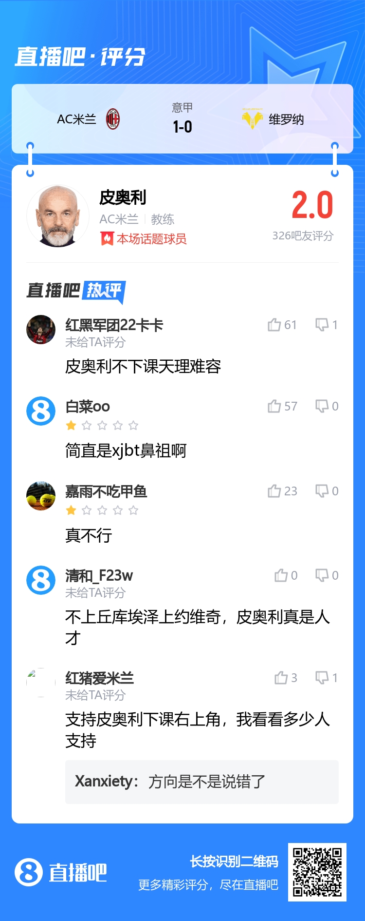 吧友评分米兰主帅皮奥利仅获2.0分:不下课天理难容,xjbt鼻祖!
