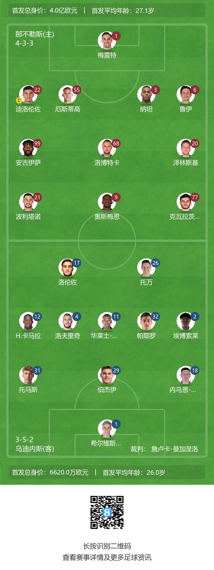 9月27日讯 02:45,意甲第6轮,那不勒斯主场对阵乌迪内斯。赛前,官方公布首发名单。