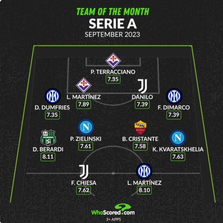 WhoScored意甲9月最佳阵:劳塔罗、基耶萨、克瓦拉茨赫利亚在列
