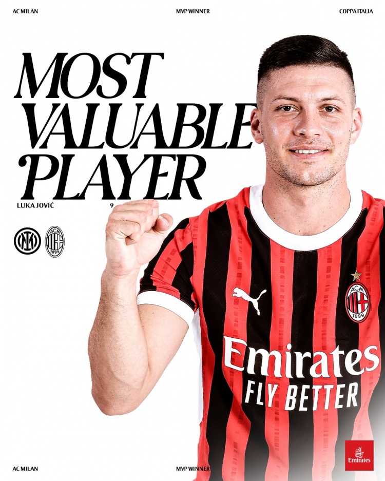 米兰官方社媒晒出海报,宣布约维奇当选德比战米兰队内最佳球员。