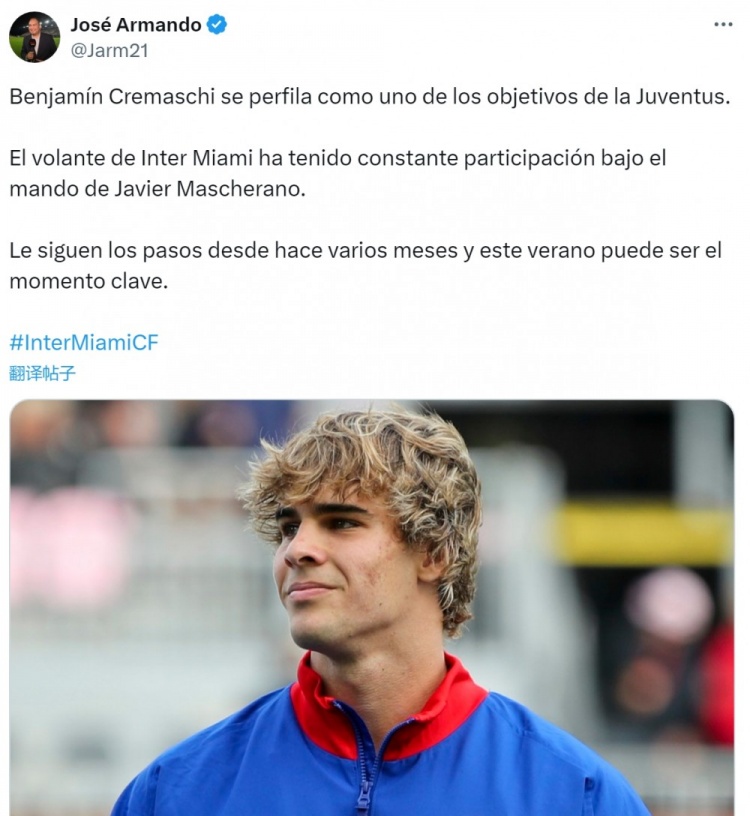 5月13日讯 据记者José Armand报道,尤文对迈阿密国际中场克雷马斯基感兴趣。José Armand透露,克雷马斯基正在成为尤文的引援目标之一,这位20岁的中场本赛季在马斯切拉诺麾下持