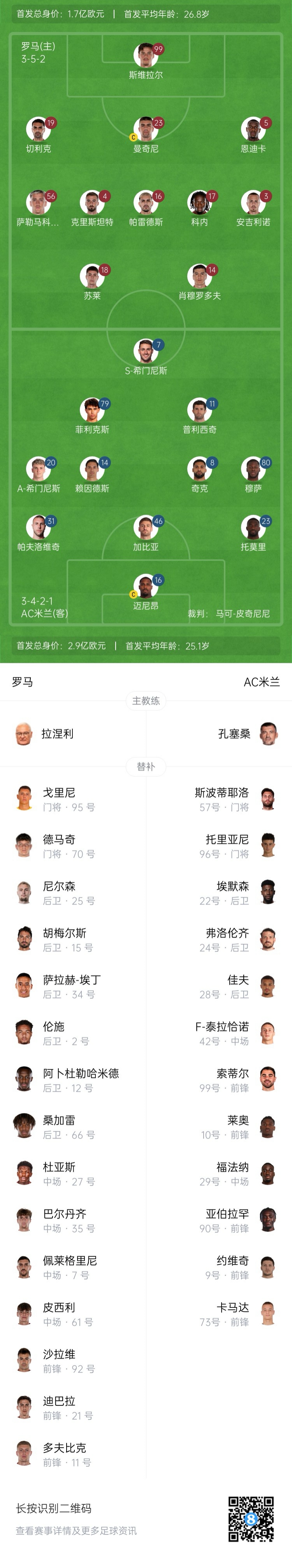 罗马首发:99-斯维拉尔、19-切利克、23-G-曼奇尼、5-恩迪卡、56-萨勒马克尔斯、17-科内、16-帕雷德斯、4-克里斯坦特、3-安吉利诺、18-苏莱、14-肖穆罗多夫