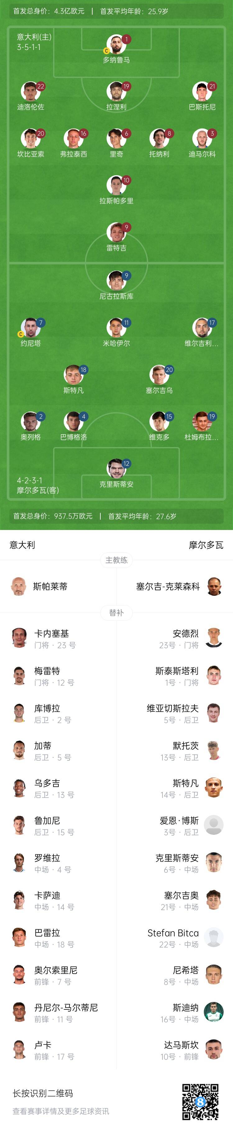 6月10日讯 世预赛欧洲区小组赛I组第4轮,意大利主场对阵摩尔多瓦。赛前,官方公布了本场的首发名单。