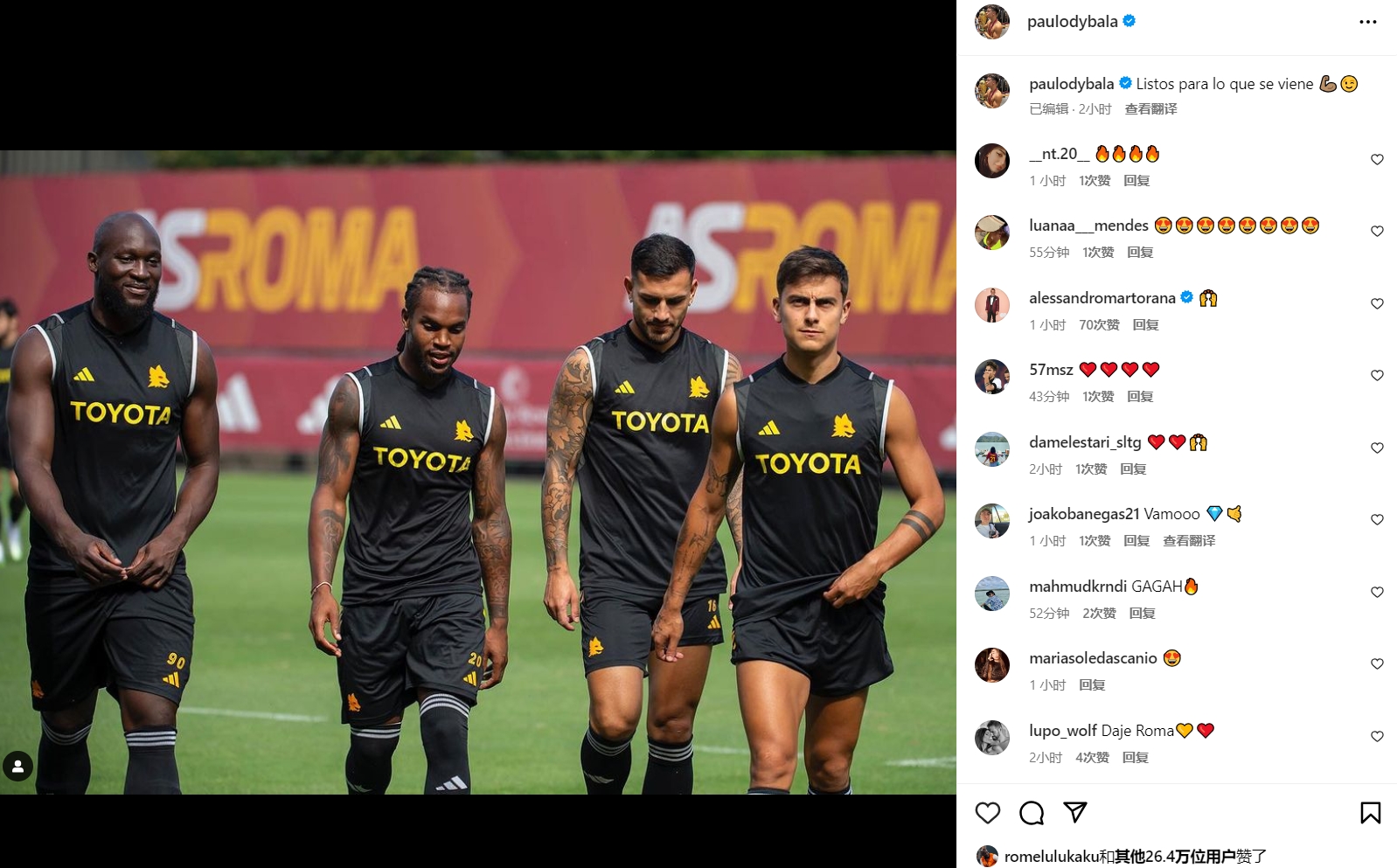 9月15日讯 迪巴拉今日在社媒晒出自己的训练照,照片中是他与球队的三位新援,卢卡库、桑谢斯以及帕雷德斯。罗马将在本月18日的凌晨对阵恩波利,罗马目前仅1平2负,深陷意甲降级区。