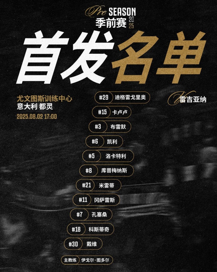 尤文首发:29-迪格雷戈里奥、15-卡卢卢、3-布雷默、6-凯利、5-洛卡特利、8-库普梅纳斯、21-米雷蒂、18-科斯蒂奇、7-孔塞桑、11-冈萨雷斯、30-戴维