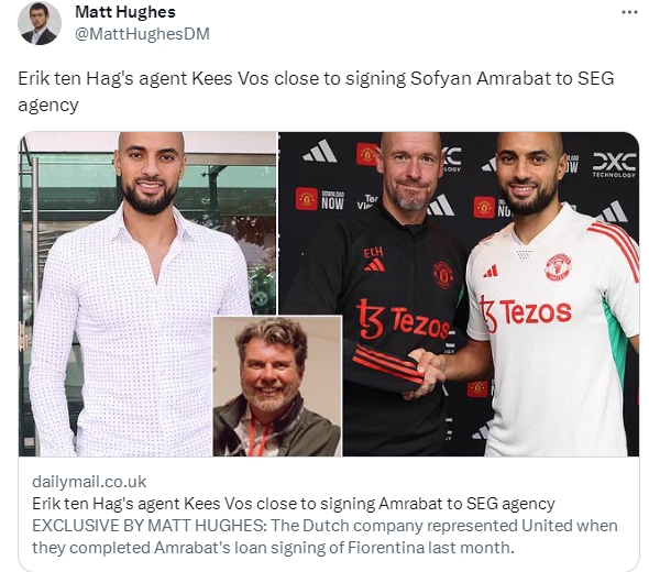 09月20日讯 《每日邮报》报道,曼联主帅滕哈赫的经纪人基斯-沃斯,正在与曼联新援中场阿姆拉巴特进行深入谈判,来让阿姆拉巴特与他的经纪公司SEG(Sports Entertainment Group)签约。