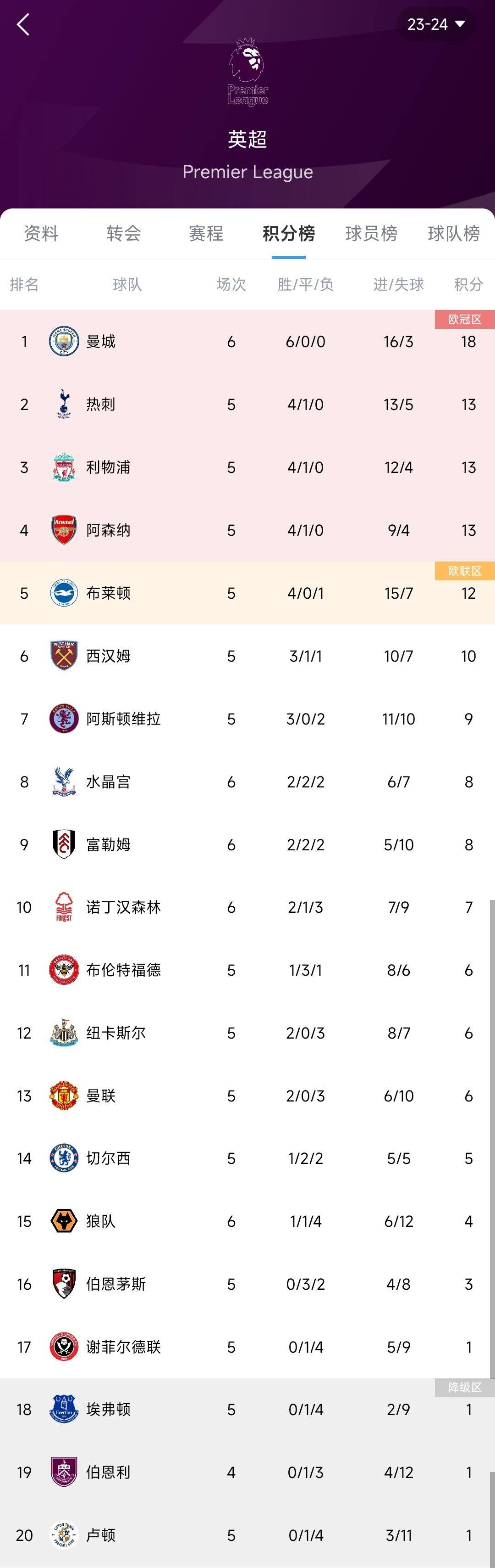 09月24日讯 英超第6轮结束三场对决,其中曼城2-0击败森林,水晶宫0-0富勒姆,卢顿1-1战平狼队。曼城取得英超六连胜强势领跑,卢顿获得队史英超首分。