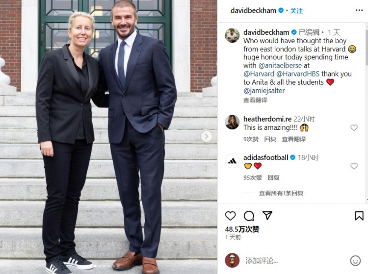 贝克汉姆晒出了自己与哈佛商学院企业管理教授安妮塔-埃尔伯斯的合影并写道:“谁能想到这个来自伦敦东部的男孩有朝一日会在哈佛大学演讲?今天非常荣幸能在哈佛商学院和安妮塔-埃尔伯斯共度时光,感谢安妮塔和所有的学生们!”