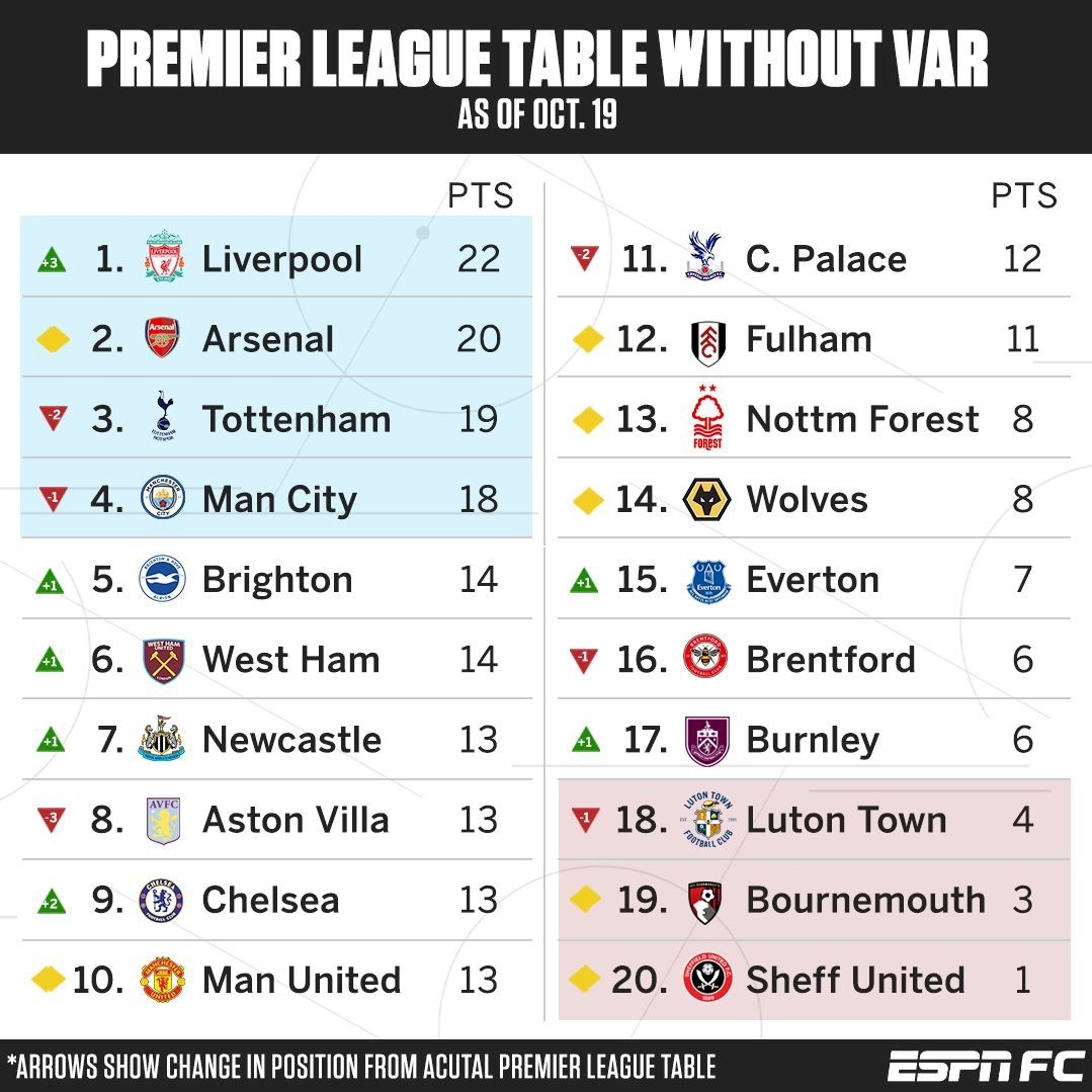 10月20日讯 ESPN统计了本赛季英超在没有VAR情况下的积分排名情况。