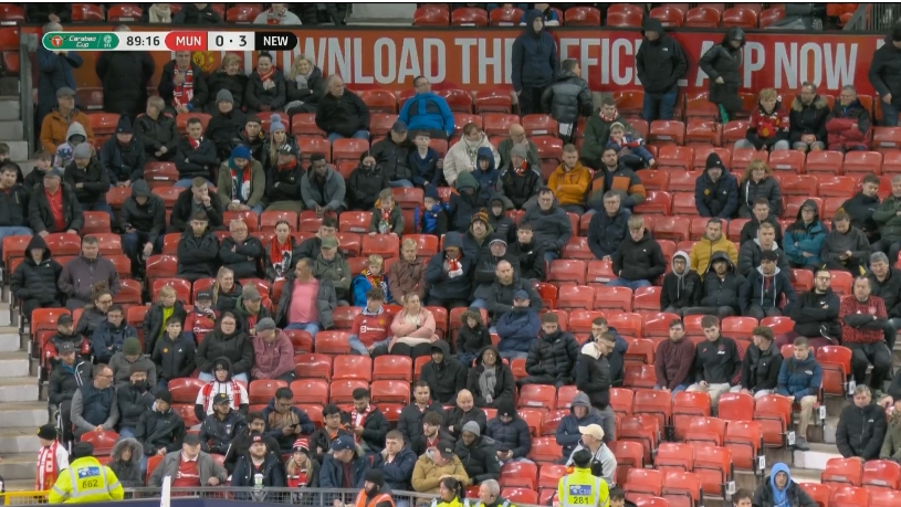 11月2日讯 曼联联赛杯主场0-3不敌纽卡斯尔,下半场部分曼联球迷提前离场。